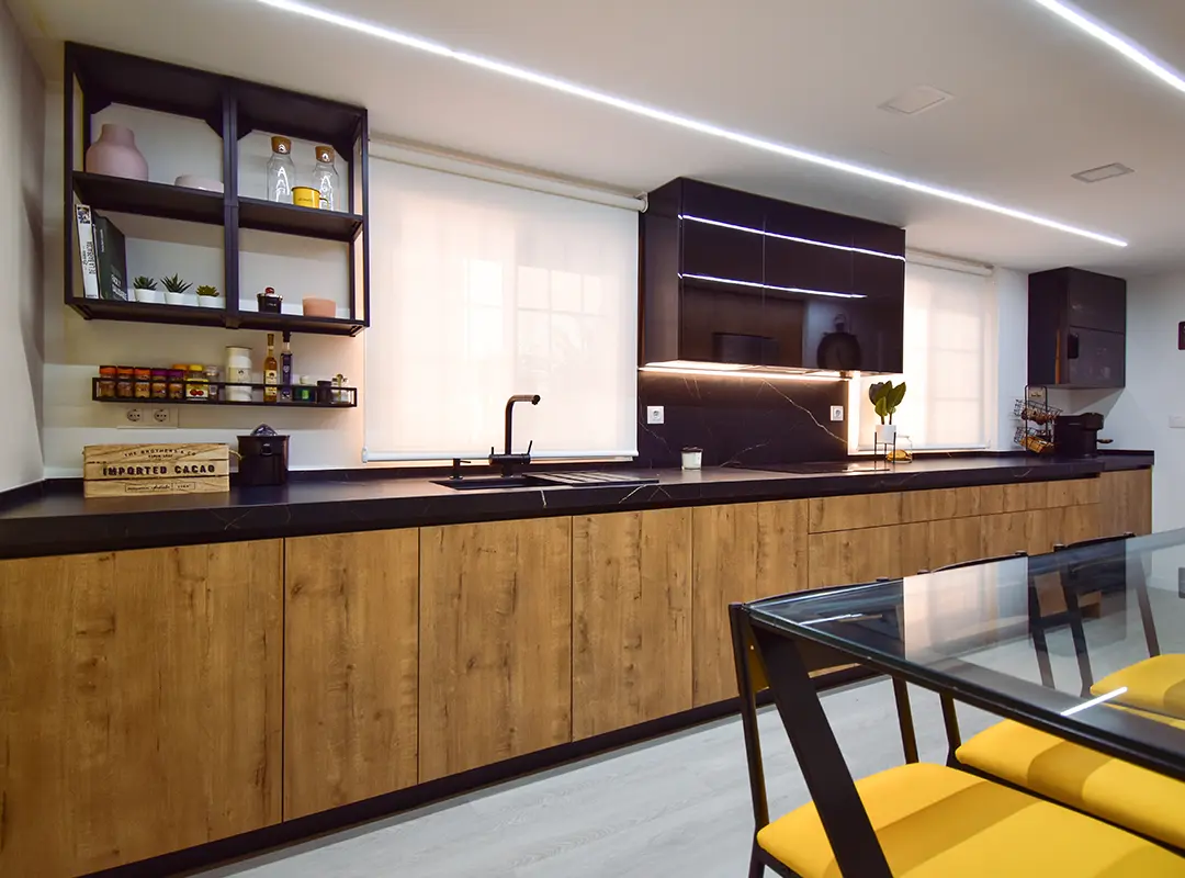 En este proyecto hemos utilizado el modelo roble 114. Los detalles negros en muebles y encimera dan ese toque vanguardista que muchos quieren pero pocos logran.