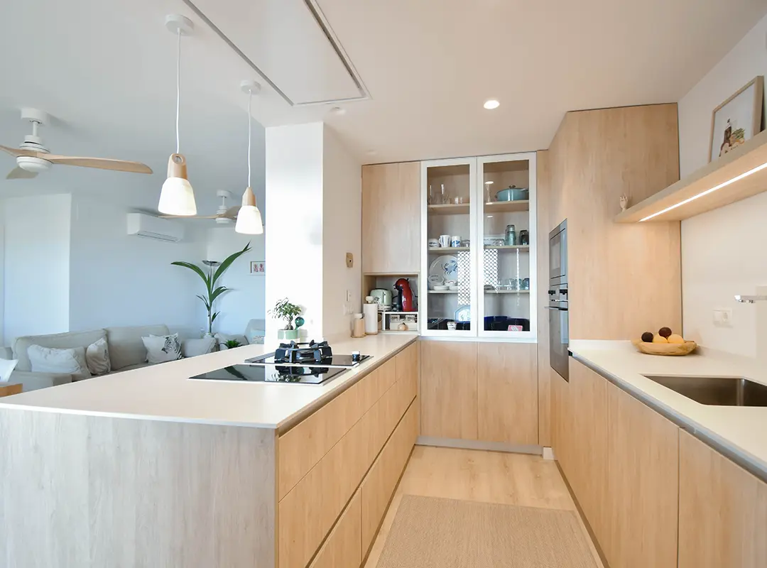 Esto ayuda a que la cocina parezca más luminosa y abierta, contrarrestando la posible sensación de encierro.